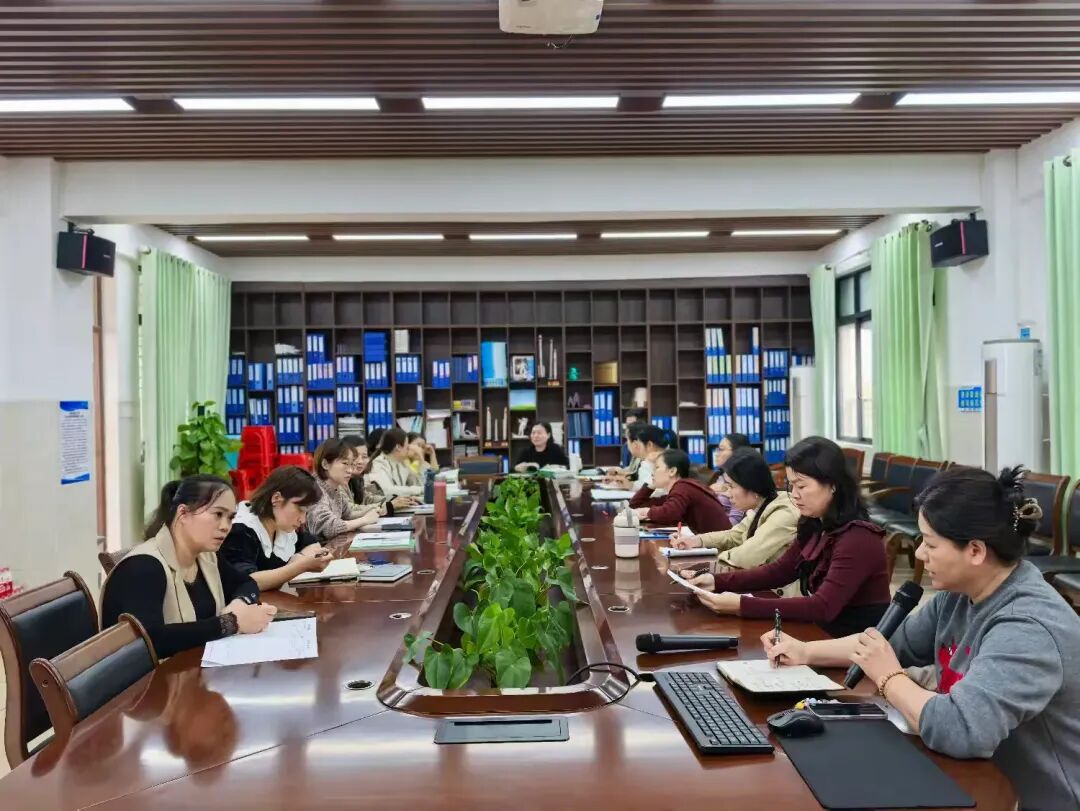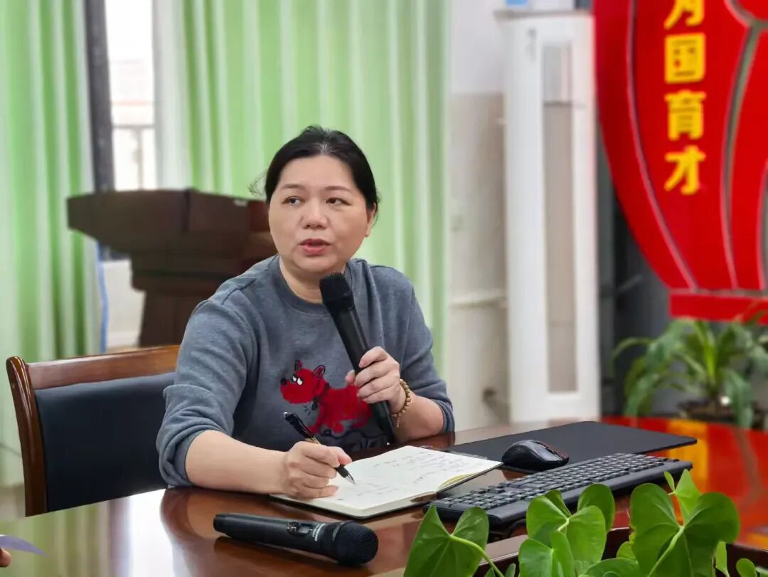林昭君组长主持着本次英语组大教研。她从容地梳理近期工作重点,将教学计划、试卷命题、作业设计等任务逐一拆解部署。