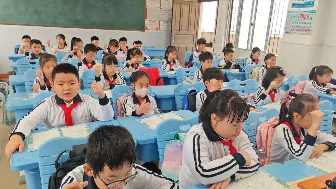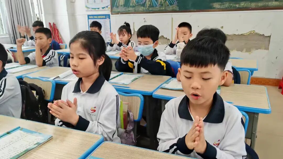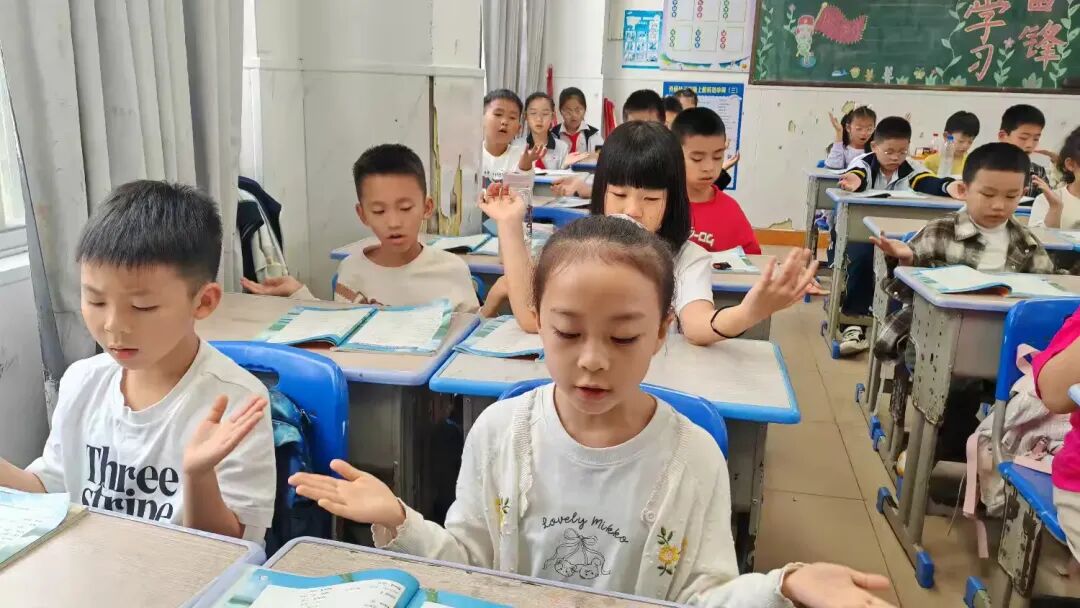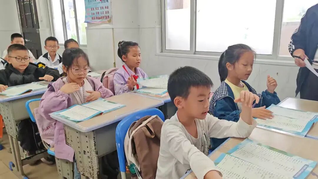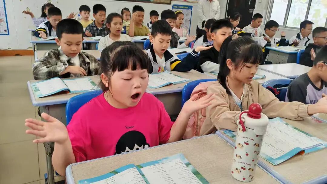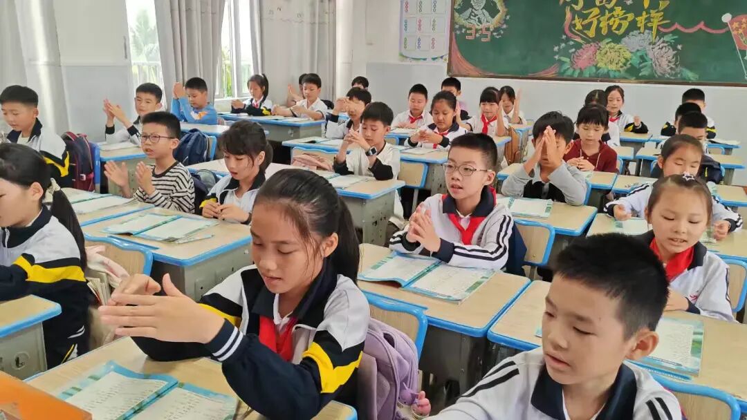教室里,三(1)班的同学们端正坐好,他们的手势不够统一,发音不够整齐。
