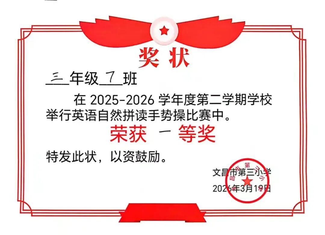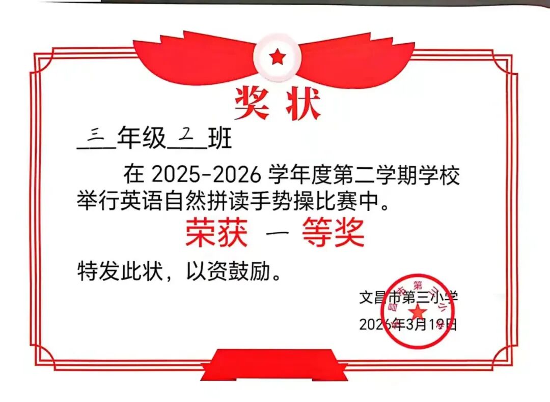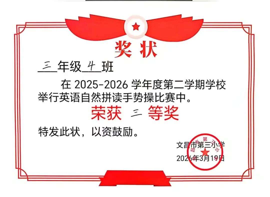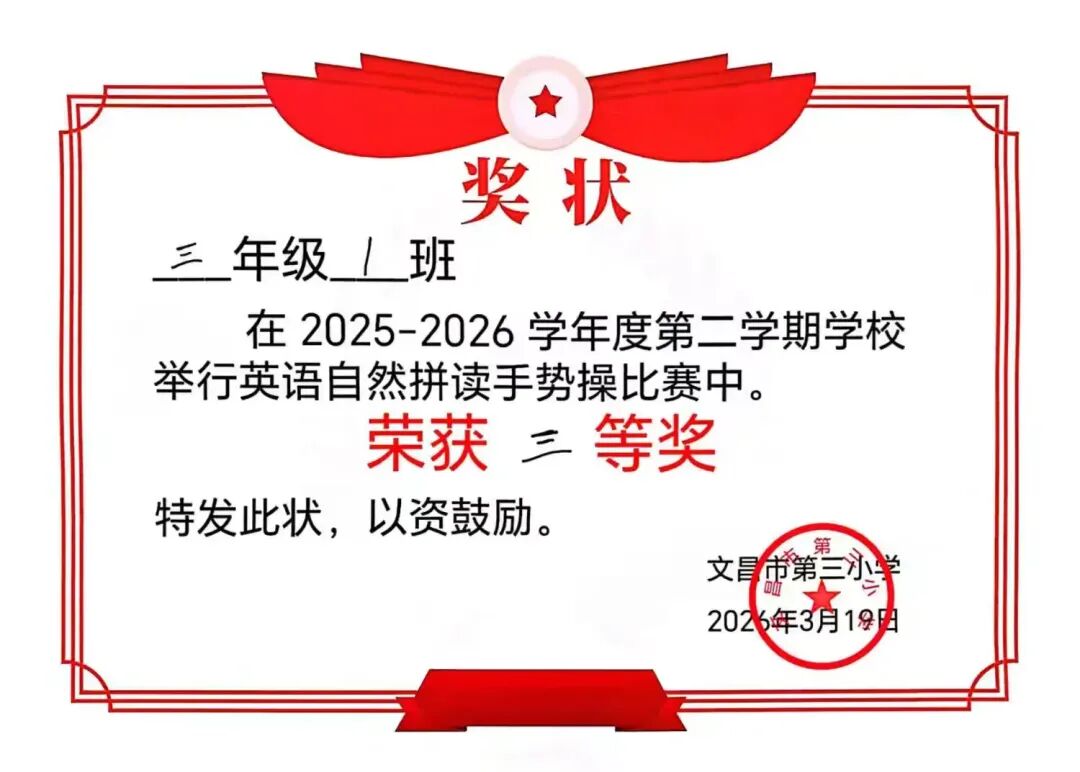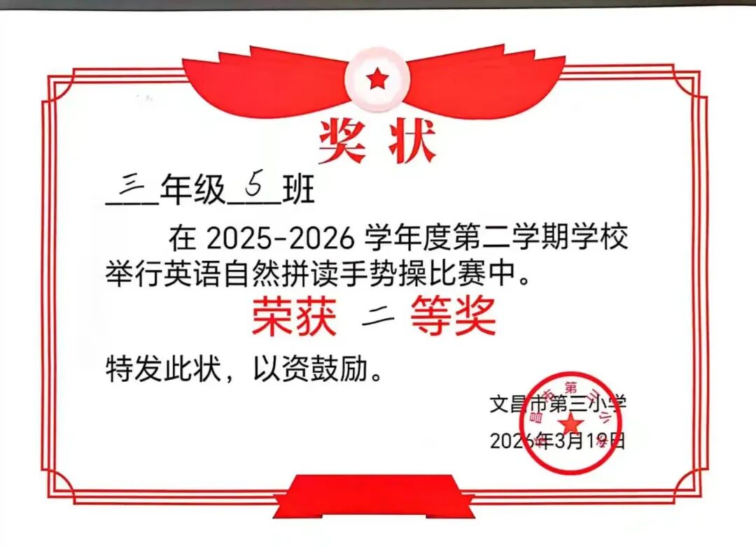 本次三年级英语自然拼读手势操比赛于2026年3月18日圆满结束。比赛以班级为单位,全员参与,展现了学生饱满的精神面貌和统一的团队形象。各班级动作基本准确整齐,节奏同步,较好地巩固了自然拼读知识,达到了激发兴趣、提升语音素养的预期目标。通过比赛,培养了学生的集体荣誉感和协作精神。评委组依据评分标准公正评判,最终评选出一等奖2名、二等奖4名、三等奖3名。活动组织有序,取得了良好效果。