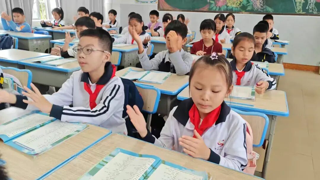 三(3)班的同学们在课堂上整齐划一地做着手势操,动作协调一致。他们专注的神情和认真的态度,体现了良好的团队协作精神。