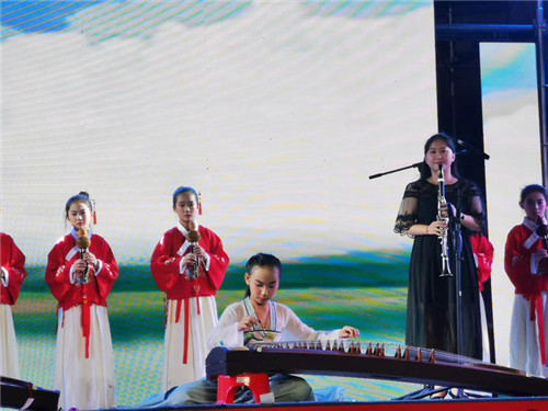 在学校庆祝“畅想新时代·喜庆七十年”的元旦晚会上表演器乐合奏《万泉河水清又清》取得圆满的成功!
