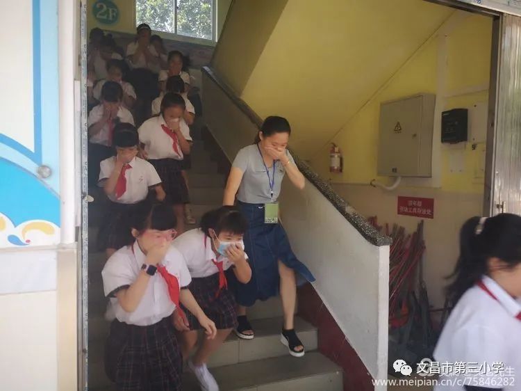 在整个演练撤离过程中,参演学生都能谨记注意事项。疏散到楼梯时,一手挡住头部,一手用口罩或红领巾捂住口鼻。楼梯口的负责领导严格维持秩序,使演练没有出现推挤、摔倒、践踏等事故。