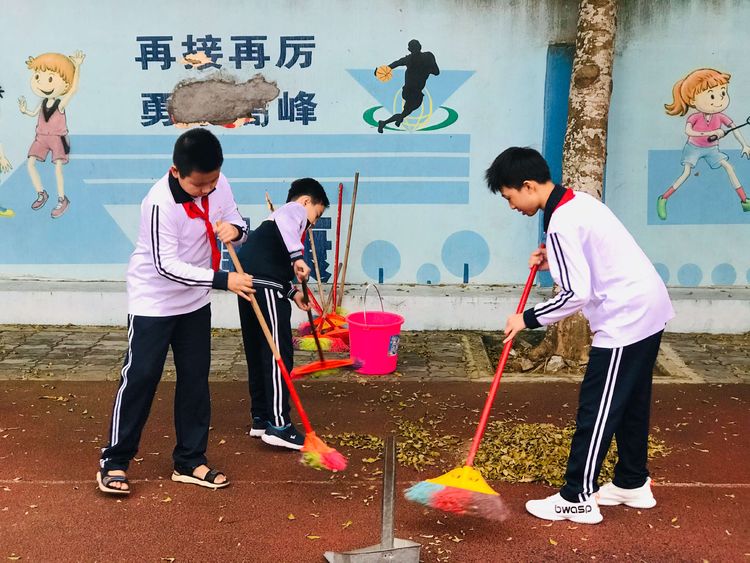 秋天到来,落叶增多,学校清洁离不开同学们的辛勤劳动。